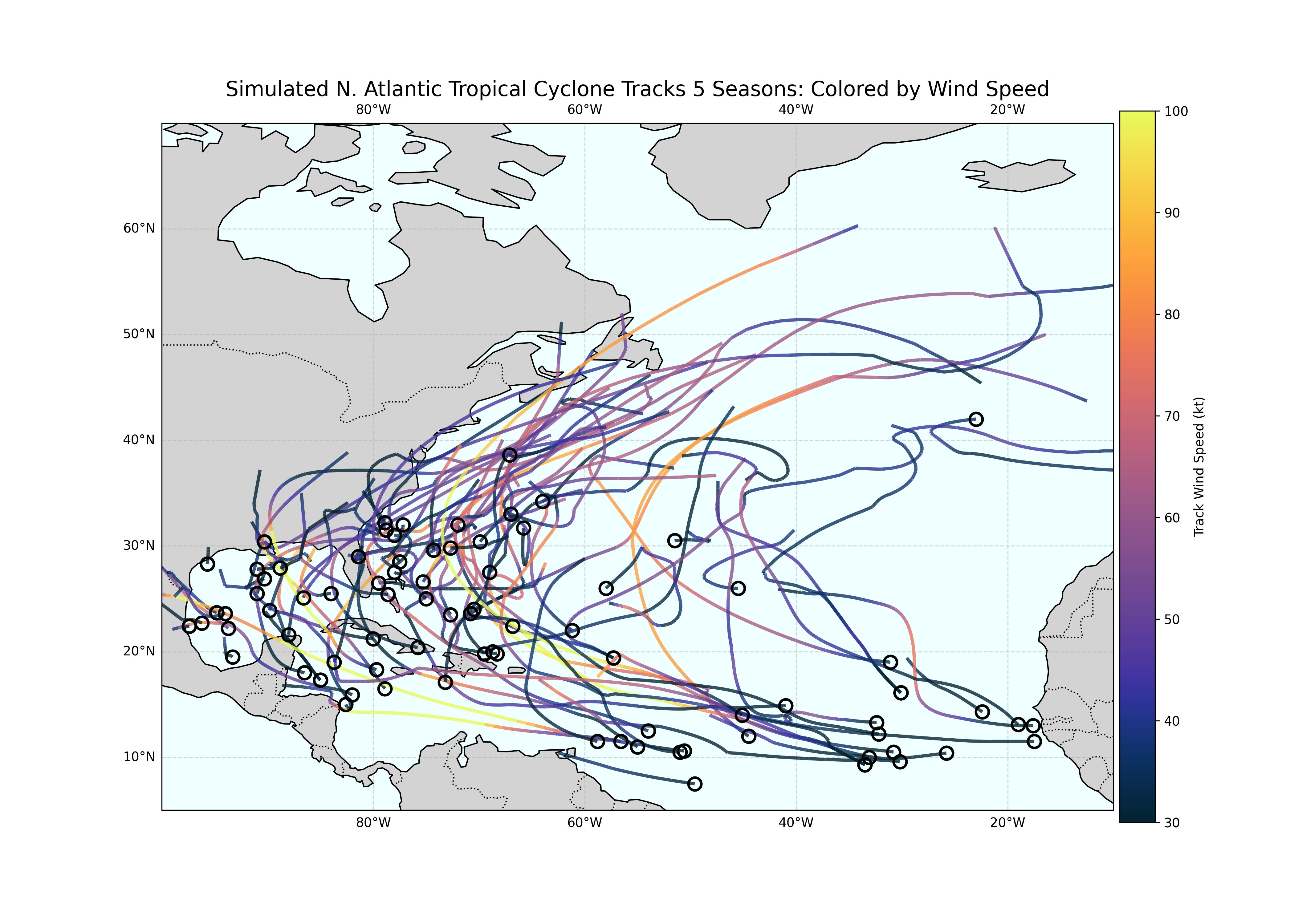 The model preserves storms' historical memory and produces realistic tracks, track densities, and wind distributions. WHITS builds on its predecessor HITS with additional wind parameters and smoother transitions to better support risk and hazard modeling applications. The catalog package includes the full stochastic catalog, supporting Python code used for data generation, and the validation figures presented below.