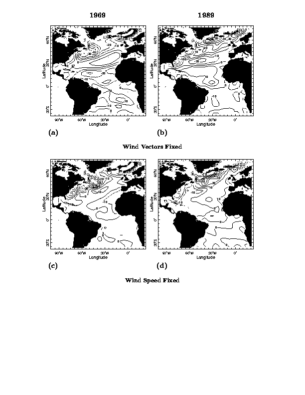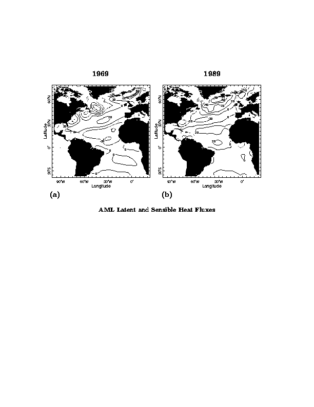 To examine the agreement between model and observed fluxes we look at two winter averages of January through March for 1969 and 1989 that exhibited opposite extreme states of the NAO. (We chose to check the model's ability to simulate the fluxes by examining specific winters, rather than an EOF for example, to emphasize that the climate variability we are talking about is clearly apparent in the raw data.) Fig. 2 shows the anomalies of SST, surface winds and upward latent plus sensible heat fluxes as derived from the NCEP reanalyses for these two winters. The latent and sensible flux anomalies are almost always the same sign. In the tropics the latent heat flux anomalies dominate, but at high latitudes they can be close to the same magnitude. Generally the anomalous turbulent fluxes are of the sign that would create the SST anomalies, e.g. anomalously positive fluxes above cold water. This relationship was noted by Cayan (1992a, 1992b) and is indicative of the atmosphere forcing the ocean. Figure 3 shows the modeled latent plus sensible heat flux when forced with observed SST. It is clear that the AML model does a reasonable job of reproducing the amplitude and spatial pattern of the observed flux anomalies.