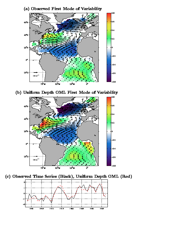 In order to evaluate the observed and modeled variability we perform analyses by singular value decomposition (SVD; Bretherton et al. 1992) between SST and vector wind. The first observed mode of variability, which explains 25% of the variance of SST and 25% and 20% of the variance of zonal and meridional winds during the January to March season, is shown in Figure 6a and the SST time series in Figure 6c. The corresponding modeled patterns and SST time series are shown in Figures 6b and 6c. The observed first mode of variability shows the familiar tripole pattern of SSTs. When the waters are anomalously cold in the high latitude North Atlantic and subtropical North Atlantic they are anomalously warm in the mid-latitudes. The wind pattern that accompanies the SST field shows an anomalous anti-cyclonic circulation whose influence spans the entire North Atlantic. This circulation strengthens the northeast trades inducing ocean cooling. At higher latitudes the mid-latitude westerlies are shifted north compared to climatology and intensify, inducing cooling in the high latitude North Atlantic and warming in the mid-latitude Atlantic. As mentioned in Section 2 advection is also important in some areas. For example, advection of warm moist air poleward aids the warming of waters immediately off the United States coast. The pattern is the North Atlantic Oscillation.