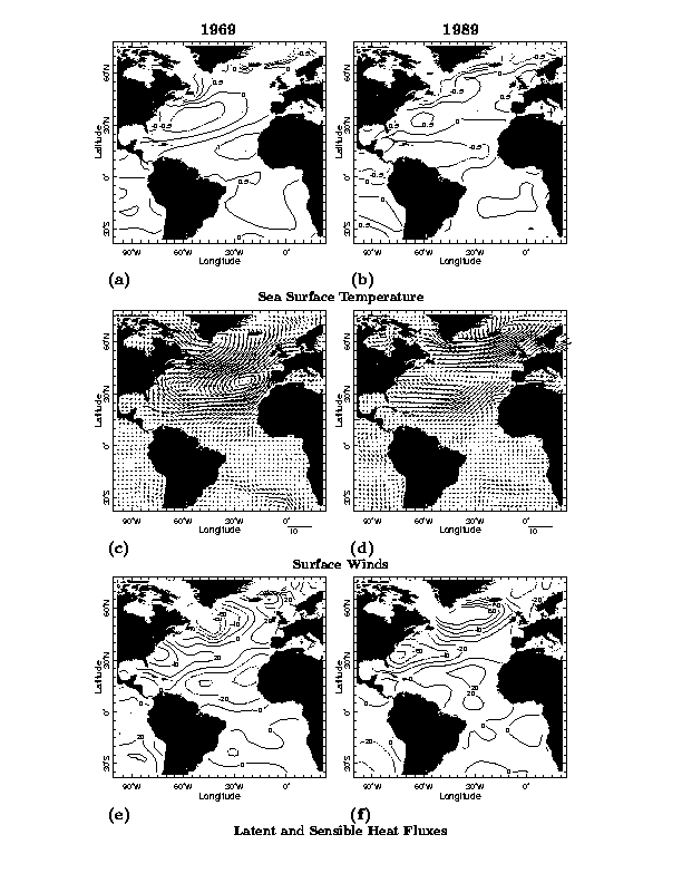 To further examine the role of ocean heat transport we looked at the heat budget of the ocean mixed layer averaged over different areas. First we took an areal average over the subtropical North Atlantic. Here the time series (not shown) of the heat budget terms show strong correspondence between changes in SST, the surface fluxes and the wind forcing but no systematic relationship to the ocean heat transport. This suggests that the weak relationship between SST and ocean heat transport uncovered by the SVD analysis is of marginal statistical significance. In contrast, an area average in the subpolar gyre shows a strong relationship between SST changes, surface fluxes, ocean heat transport and the wind forcing. Increased westerlies cause dynamical cooling of the ocean that is in phase with the cooling by surface fluxes. This is further evidence for our claim that changes in ocean heat transport are primarily associated with anomalous Ekman drifts that establish themselves instantaneously once the wind changes. We also computed the time series of northward heat flux by the Gulf Stream off Cape Hatteras. This showed no decadal variability or trend in contrast with the coupled model runs of Grötzner et al. (1998) where heat transport in this area precedes the development of SST anomalies in the subpolar gyre. We were unable to find any evidence for any lead or lag relationship involving ocean heat transports. While this is not a comprehensive examination of the possible roles for ocean heat transport it is in contrast with model simulations of the tropical Pacific Ocean where it easy to identify changes in ocean heat transport leading the development of SST anomalies (e.g. Seager 1989).