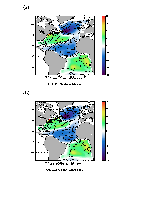 To compare the roles of surface fluxes and ocean heat transport in determining the SST variability we performed two regressions of the modeled surface heat fluxes and anomalous ocean heat transports, integrated down to the base of the modeled ocean mixed layer, each against the time series of the SST anomalies of the first SVD mode. These are shown in Fig 8a and 8b. The anomalous ocean heat transport is defined positive if it warms the SST whereas the anomalous surface heat flux is positive if it cools the SST. The surface heat fluxes perfectly match the SST anomalies in the sense of the atmosphere forcing the ocean. Ocean heat transport is important in the northern North Atlantic where it is the same magnitude as the surface fluxes. We broke the anomalous heat transport into two terms, advection of the mean SSTs by the anomalous currents and advection of the anomalous SSTs by the mean currents. Advection of the mean temperature by the anomalous currents was the most important term throughout the basin. During a high index NAO year, stronger westerlies drive a southward Ekman drift over the high-latitude ocean that cools the SSTs. This amplifies the cooling due to enhanced surface fluxes. This anomalous Ekman drift increases the simulated SST anomalies relative to the case with a variable depth mixed layer. Clearly, the reasonably sized SST anomalies simulated with a uniform mixed layer depth, and no anomalous ocean heat transport, were obtained for the wrong reason. In reality, mixing down to considerable depths, ocean heat transport and surface fluxes are important in this area.