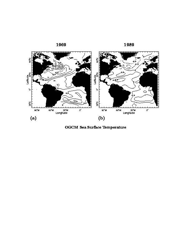 As a final assessment of the model's ability to reproduce the dominant mode of observed climate variability we show in Fig 9 the modeled SST anomalies for January-February-March averages of 1969 and 1989. These can be compared with the observed SST anomalies for that period shown in Figure 2. It is quite clear that, with modest differences in position and amplitude, the GCM can accurately reproduce the observed variability.